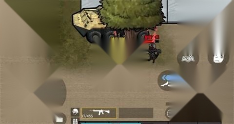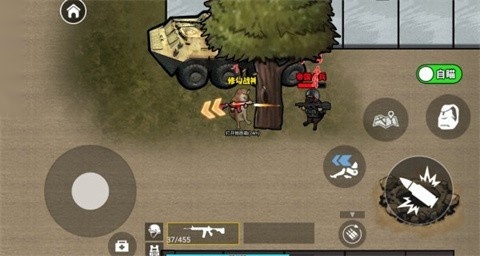 3、和敌人对峙的时候,要借助树木之类的掩体来躲避攻击,同时留意枪械的弹药数量。等弹药充足了,就点击右边的“点击射击”按钮瞄准敌人,另外还要通过方向键调整自己的站位,防止暴露位置。