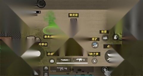进入战场后,首先借助左侧的“滑动方向移动”功能操控角色,靠近“撤离战场”区域旁边的掩体;与此同时,优先拾取“回血道具”,并通过“点击更换武器”的操作来装配已经搜集到的枪械,提前完成战斗准备工作。