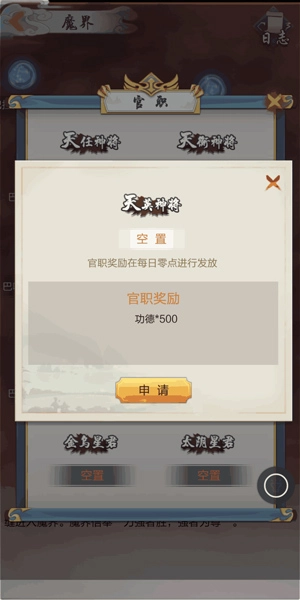③官职:每个界都有27个官职,官职的大小对应的是功德(官职从上往下,从大到小),担任官职会在每天0点额外获得功德。提醒:三界的同一位置官职给的功德是一样的。
