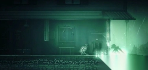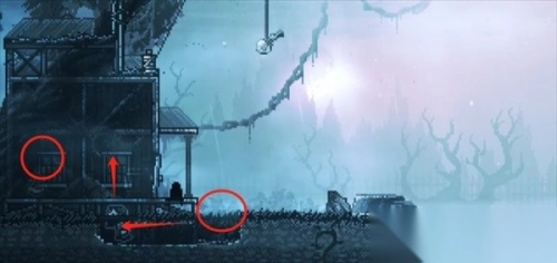 3.切换为流浪者视角。往左走到房子前松动的木板上,站在木板上跳几次,破坏木板,从木板下的坑道爬进房子,获得镰刀。然后推开房门出去,砸死门外的黑色怪物。