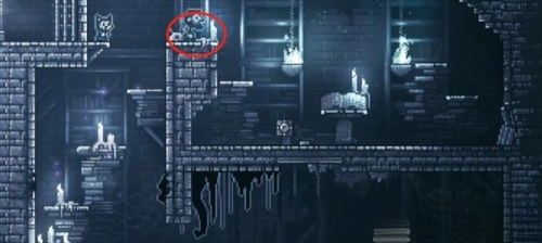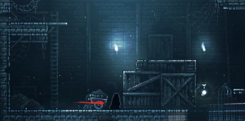 5.把推车推到梯子和黑色怪物中间的地方,然后爬上梯子,跳起来勾引黑色怪物。黑色怪物跳下来后,把推车推过去压死怪物。之后继续往右,进入关着黑色怪物的笼子左边。
