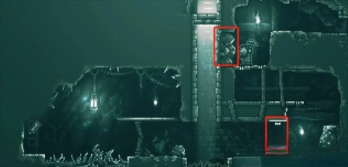 15.遭遇怪物后,迅速返回下图的地方,等怪物跳过右边后,迅速爬左边的梯子,往左跑,跑到左边的尽头后往上爬,爬到最高层后往右跑,直到怪物掉进尖刺坑里。