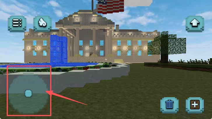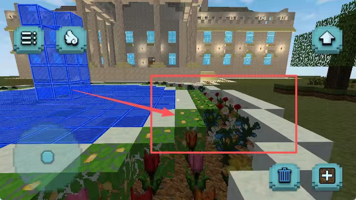 2、看像素建筑画面,点左下角红框圆形物体,可能是对建筑前方水池区域进行操作。