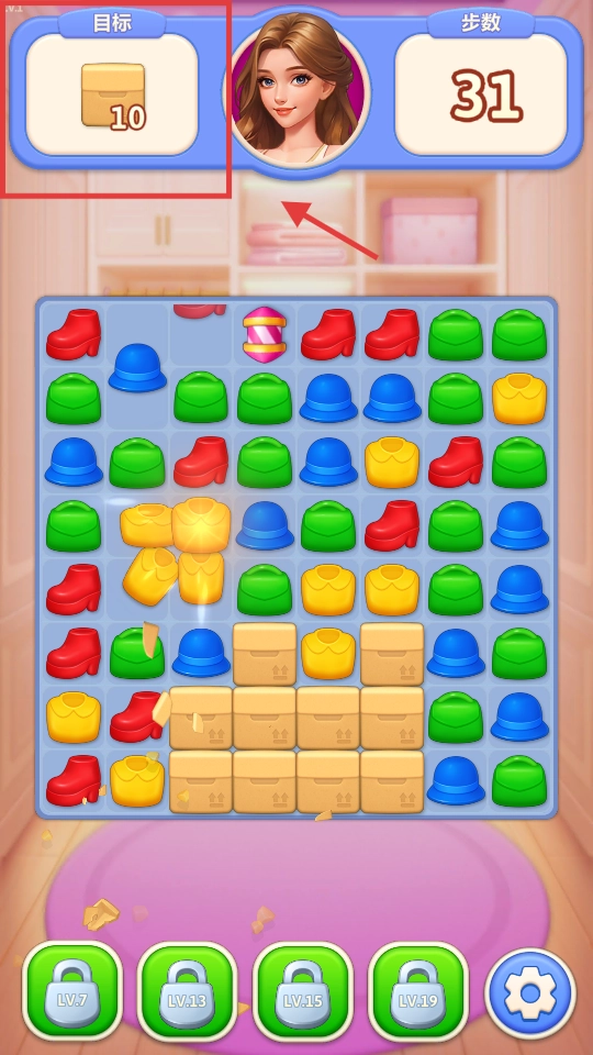 3、目标剩余7个【箱子】、步数30时,优先消除红色方框区域元素,触发连锁消除加速箱子收集。