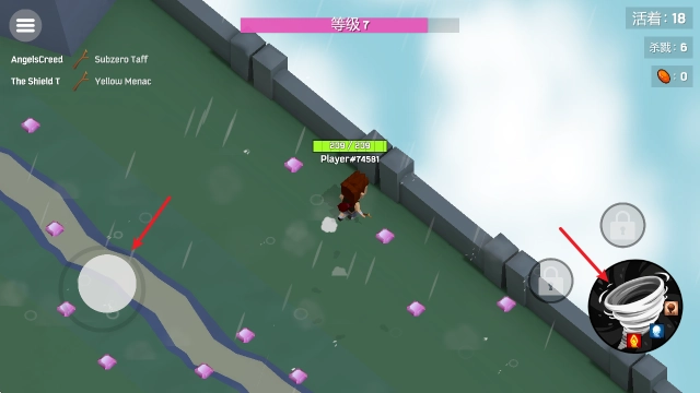 1、通过左侧摇杆移动,点击右侧按钮释放魔法来消灭敌人。