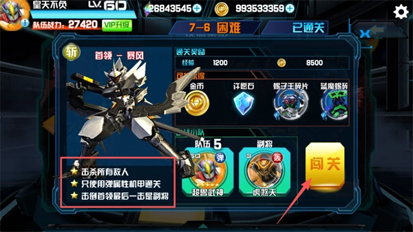 6、注意在屏幕左侧显示的三星条件,随后点击屏幕右下方的“闯关”,开始战斗。