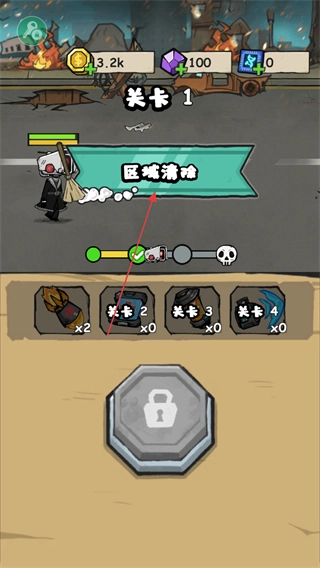 1、进入关卡1,本次目标为区域清除,请注意观察上方的金币与钻石数量,随后开启战斗。