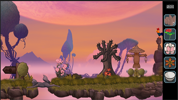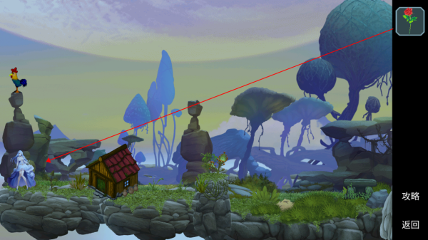 1、点击第一关中的公鸡能够切换时间,小屋旁边摆放着太阳瓶和月亮瓶,需要在不同的时间去获取它们,分别用来收集朝露水与晚露水;