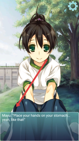 3、跟随角色Mayu的指引,按照将手放在腹部的提示完成动作互动,点击解锁后续健身指导环节。