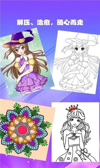 1、设计精美且色彩搭配自由:以精致的人物设计为基础进行创作,丰富的色彩选项可供玩家随心选择,根据个人审美为图像赋予色彩,让原本单调的线条通过色彩呈现出独特的艺术风格。