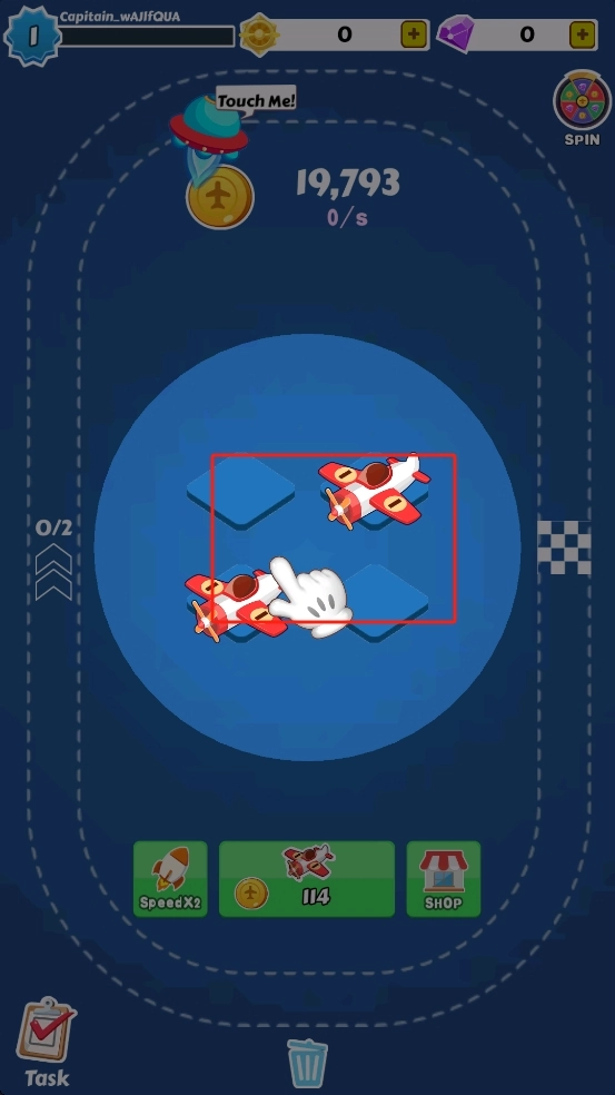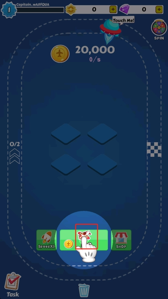 1、进入初始界面后,点击底部红框里的飞机图标,消耗金币将飞机投放到跑道上,飞机便会自动飞行赚取金币,以此积累资源。