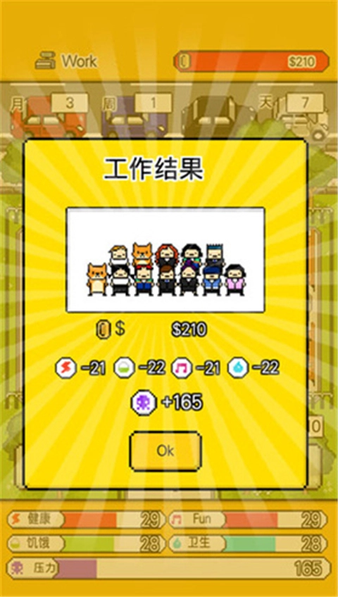 5、隐藏故事与结局:包含众多随机事件和隐藏剧情,玩家的选择会引导出50多种不同结局,增加游戏的重复游玩价值。1、属性管理机制:要留意能量、饥饿、压力等状态,借助运动、烹饪、休息等途径保持角色的健康状态。