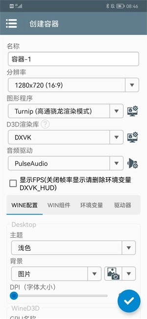 2、安装完成后点击右上角的+号创建容器,然后根据自己的手机配置来调整参数属性。