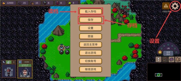 进入对局后点击右上角设置打开设置面板,其中保存为局内存档,载入存档为局内读档。
