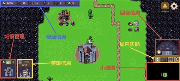 游戏左上方显示玩家拥有的资源信息,右下方从左到右依次为城镇管理与英雄信息;右下方从上往下依次为回合信息、局内功能、小地图。