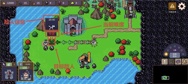 野外部分资源点会有敌人驻守,想要占领被驻守的资源点需要先对敌人进行攻击。点击资源点旁的敌人会显示其包含的兵种单位与难度(难度会根据领主所带领的兵力有所变化,带领的士兵数量越多、兵种越强大,战斗的难度就越低,推荐各位领主注意难度提示,等自身兵力发展壮大了再进行挑战哦),再次点击目标敌人即可移动到敌人位置进行攻击,战斗胜利后就可以点击资源点进行资源点占领了。