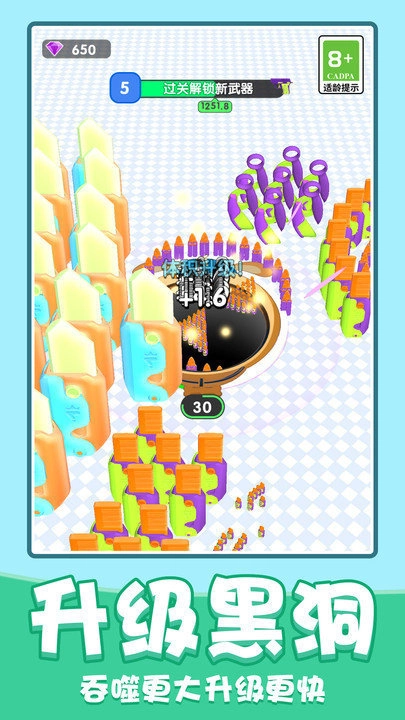 1、通过触屏滑动控制黑洞移动轨迹,巧妙规划最佳吞噬路线。