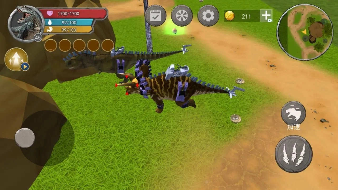 1、配备着利爪、牙齿等多样的武器装备,玩家能够借助这些武器向其他恐龙发起攻击,或是用于自我防御。