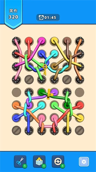 进入游戏后,玩家可先挑选一个关卡开启挑战。每一关都能看到几根缠绕在一起的绳子,玩家只需拖动绳子两端,将它们分开,不再打结,系统就会自动为玩家清除掉。要是实在理不清,别忘记可以使用下方的三个小道具来助力,它们能让玩家更轻松地闯过难关。顺利把所有绳子都整理顺后,玩家就能通关获取奖励了。