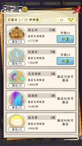3、消耗一定材料可升级/强化神通,等级越高,神通效果越高;