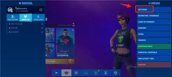 首先,启动《堡垒之夜》正版客户端,进入后找到【SETTINGS】设置选项。