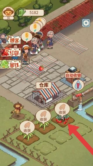 1、猴子头像等角色、“5182”货币、顾客/红包/金锭/自动收银/仓库等功能标识、“收获”操作提示以及农田等元素,共同构建出农场经营类的玩法场景。