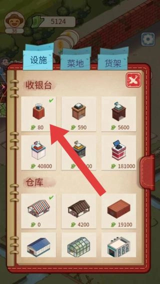 2、顶部货币、角色等级,界面分类“设施、菜地、货架”,设施包含“收银台”、“仓库”(不同样式及数值),呈现游戏内设施解锁与升级相关内容。