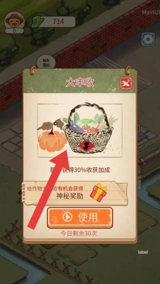 3、道具名称“大丰收”,效果为获得收获加成,给作物施肥有机会获得神秘奖励,还有“使用”按钮、“今日剩余30次”,呈现道具功能及使用规则。