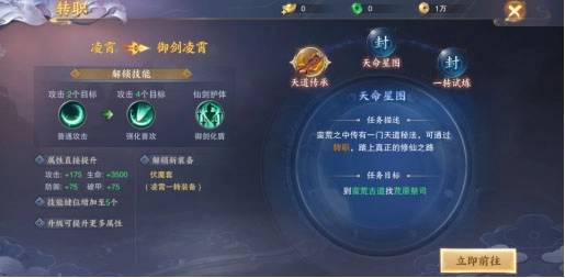 御剑凌霄达到220级后,便会开启二转任务。二转任务总共有3个阶段,根据任务提示完成3阶段的任务后,可成功转职。