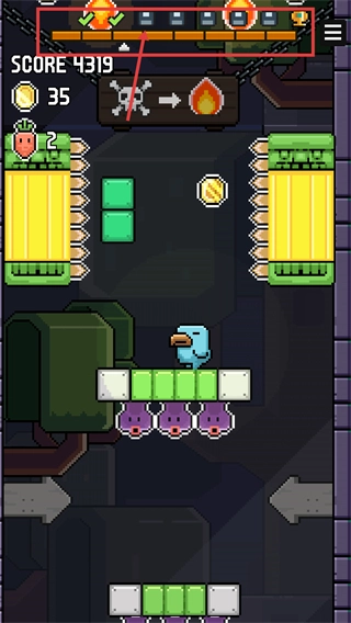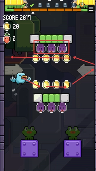 2、在关卡场景中避开紫色怪物,连续收集【金币】,助力【SCORE】数值进一步增长,同时留意场景内的移动平台。