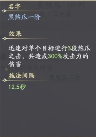 技能介绍:迅速对单个目标进行3段煞爪之击,共造成300%攻击力的伤害
