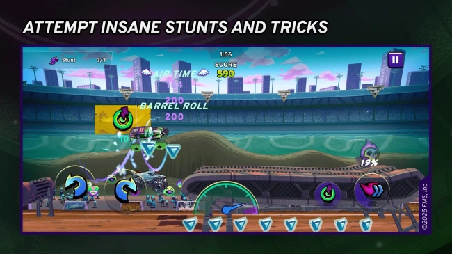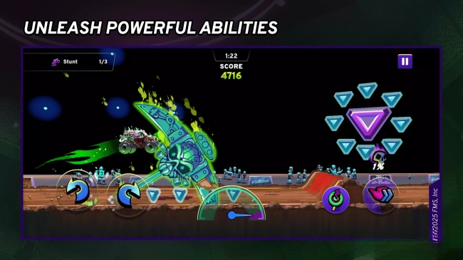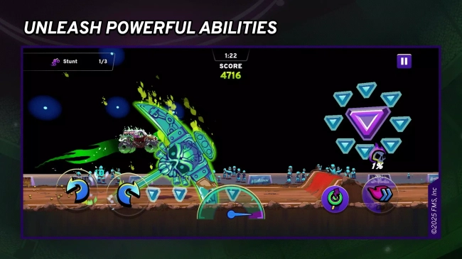通过虚拟摇杆与特技键组合,操控卡车完成后空翻,桶滚,螺旋转弯等动作,特技成功可积累氮气加速条,在竞速中实现逆转超越;