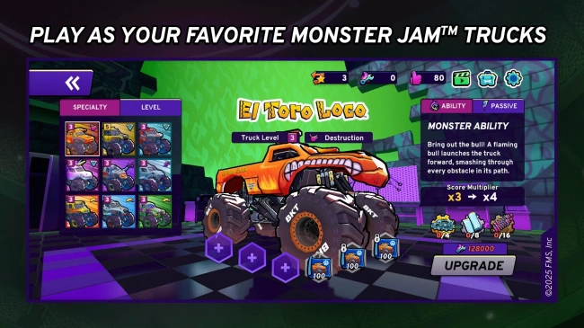 通过比赛奖励解锁新引擎,轮胎,装甲等部件,提升卡车速度,操控性与耐久度,外观涂装与装饰品可自定义,打造专属金属巨兽;