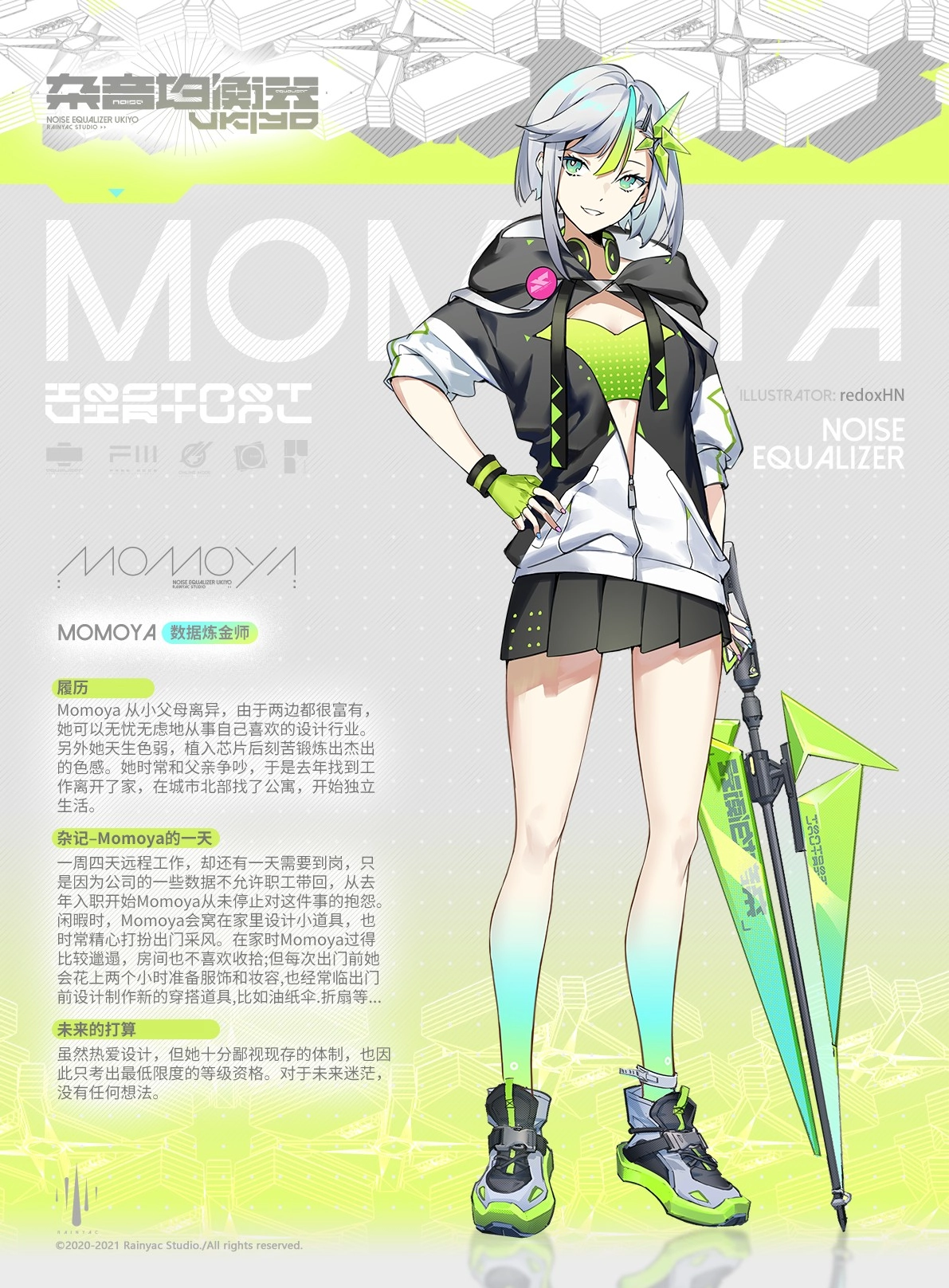 Momoya 从小父母离异,由于两边都很富有,她可以无忧无虑地从事自己喜欢的设计行业。另外她天生色弱,植入芯片后刻苦锻炼出杰出的色感。她时常和父亲争吵,于是去年找到工作离开了家,在城市北部找了公寓,开始独立生活。
