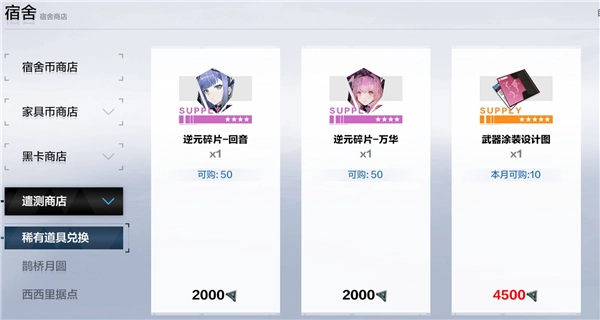 ④ 宿舍-遣测商店可兑换【亚里莎·回音】、【艾拉·万华】碎片,50片可用于解锁角色,该商店自5月30日起还将新增万事·明晰梦碎片50片的兑换。