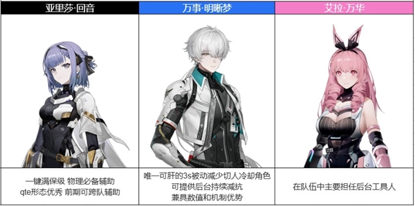 【亚里莎·回音】是物理队增幅型,【艾拉·万华】是冰队增幅型,【万事·明晰梦】是冰装甲型,根据想组的队伍确定优先级即可。
