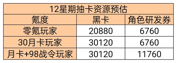 以活动奖励较少的A版本计算,0氪全勤玩家每个月可获取7000黑卡+2000活动角色研发券,三个月可得约2w7抽卡资源。