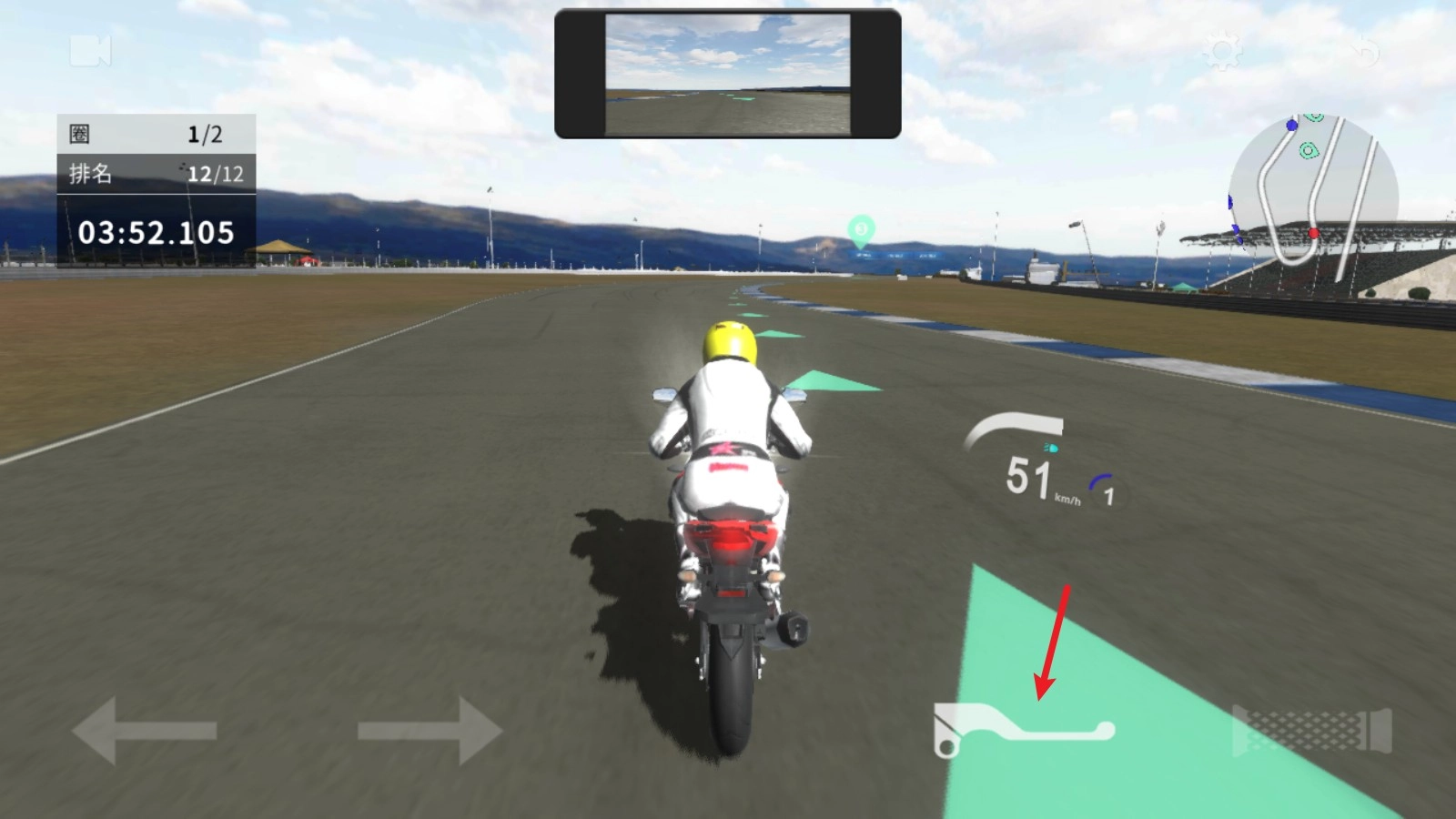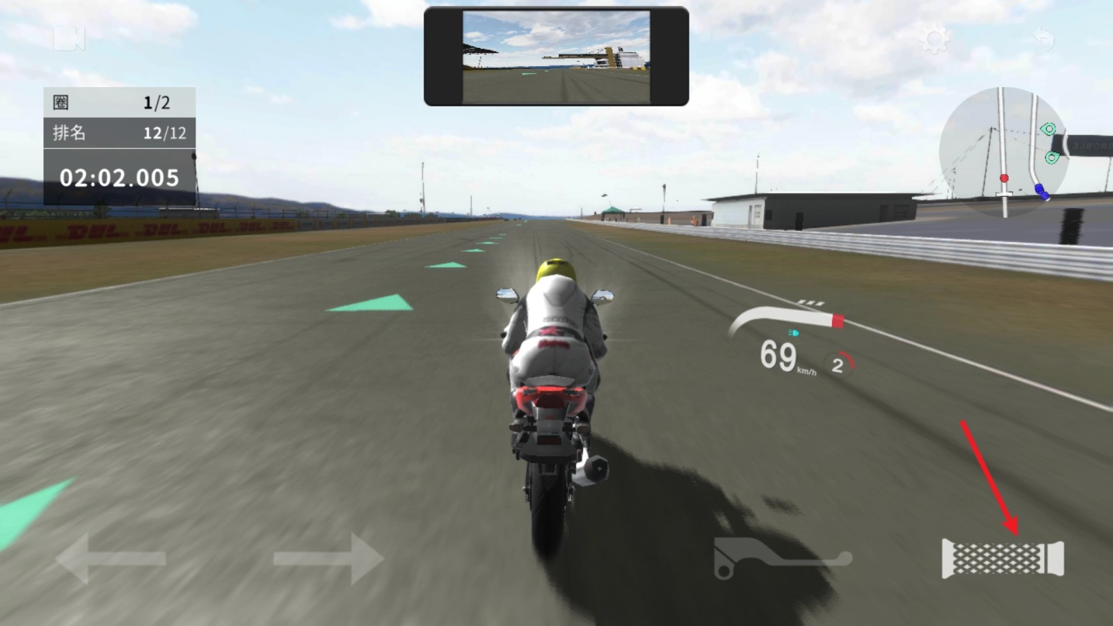 1、进入比赛后,我们要先踩油门让车辆起步,按住油门键就能持续加速。