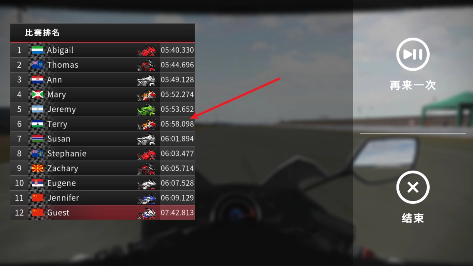 5、完成比赛后就会进行排名,第一个抵达终点的就是冠军。