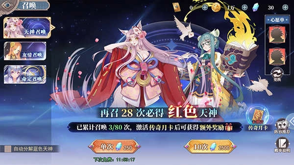 1、玩家可以通过召唤获取天神,有天神、友情、命定三种召唤方式。