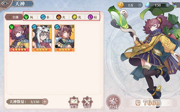1、游戏内一共有风、火、水、光、暗五种属性类型的天神,每种天神都有自己独特的技能和属性。