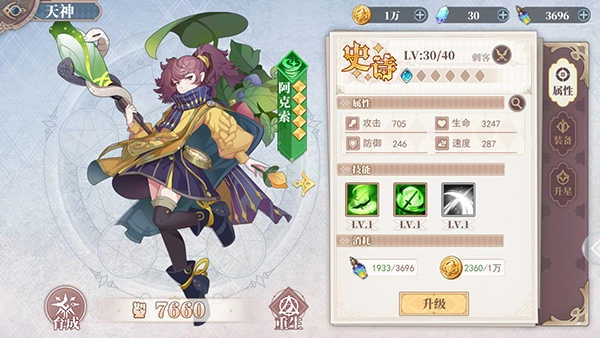 1、玩家可以对天神进行升级进阶,提升天神等级和阶级。