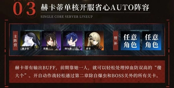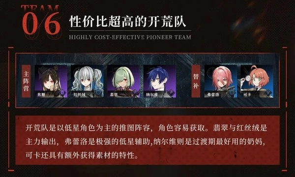 开荒队是以低星角色为主的推图阵容,角色容易获取。翡翠与红丝绒是主力输出,弗蕾洛是极强的低星辅助,纳尔维则是过渡期最好用的奶妈,可卡还具有额外获得素材的特性。