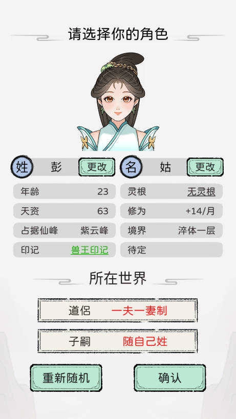 1、进入游戏后,先为你的角色取一个心仪的名字,同时也可以在这里设置道侣的属性以及子嗣相关内容