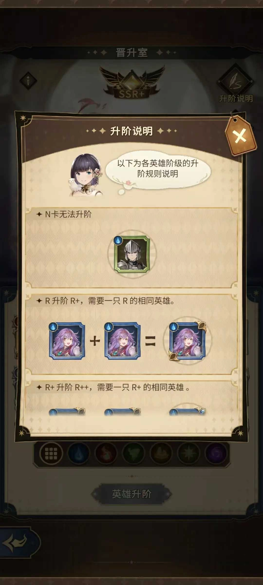 为了防止冒险家们手滑将高阶英雄消耗掉,SSR阶级的英雄只能通过冒险者手动升阶,无法使用[一键升阶]执行升阶哦~
