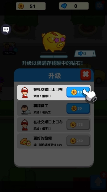 4、达到一定的金币还能够对设备进行升级和招纳更多的店员