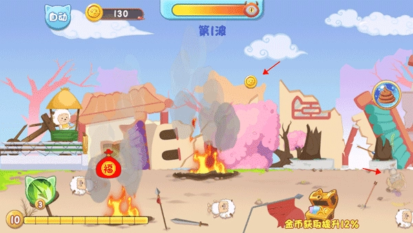 2、游戏的玩法就是点击敌人,让懒羊羊用弓箭定位到敌人身上,这样就能够打倒敌人。