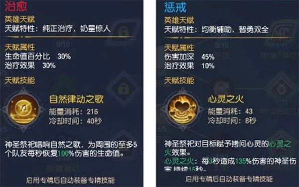 在游戏中的两种天赋分别为治疗和惩戒,惩戒增加45%的伤害加深和10%的治疗效果,天赋中的“鼓舞”可以增加团队成员5%的攻击,在输出和治疗都有不错的表现。治疗天赋增加30%的生命和30%的治疗效果,天赋中的“护佑”可以赋予玩家复活其他玩家的能力,是祭司的核心技能。