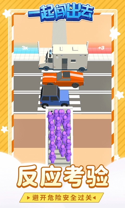 《一起闯出去》是一款关卡丰富精彩、玩法简单易懂的趣味闯关游戏。玩家需要帮助橡皮人穿过一条条马路,马路上来来往往的车辆十分危险,得仔细观察汽车行驶规律,抓住空隙及时通过就能顺利通关。