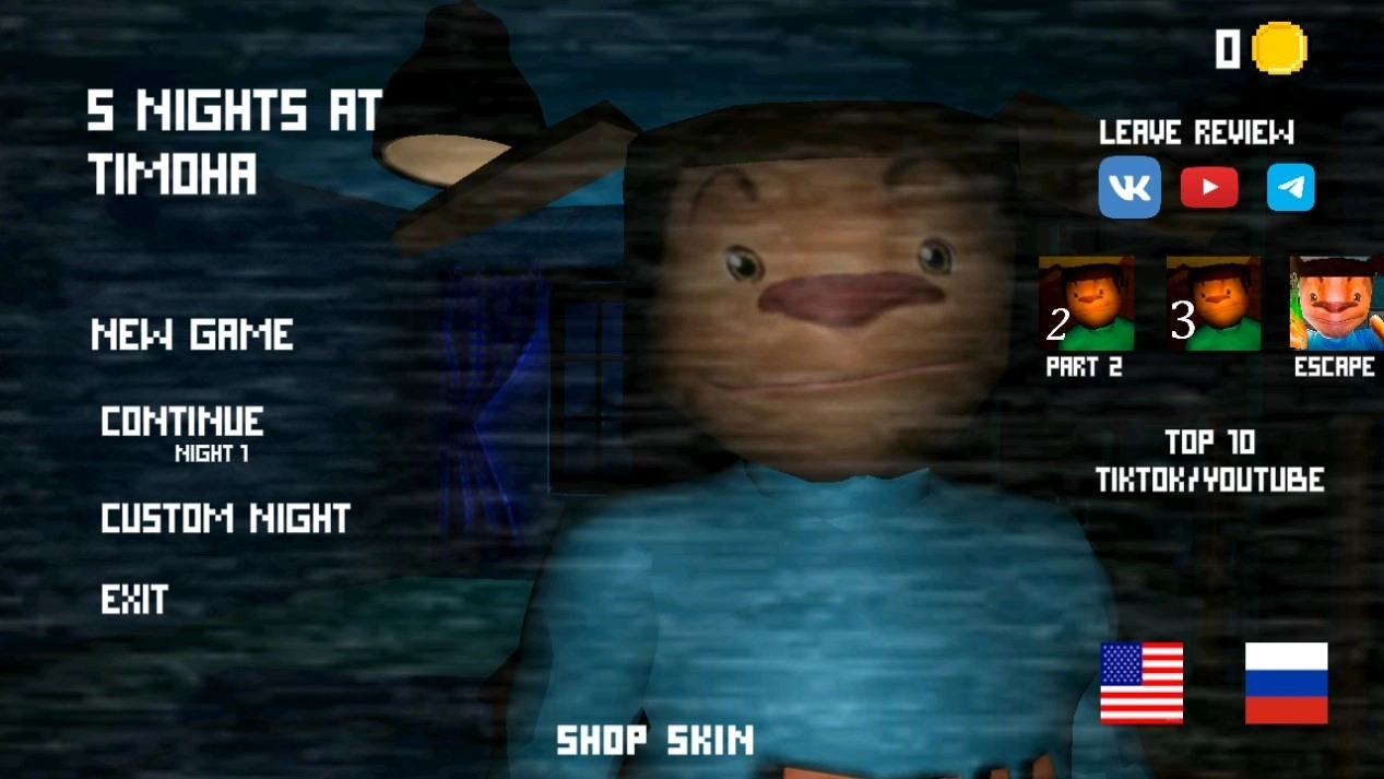 5nightsatTimokha《5 Nights at Timokha》是一款极具挑战性的冒险恐怖游戏。在游戏中,你需要充分利用身边的各类资源与道具,努力撑过五天的生存考验。期间会有鬼娃娃对你展开追捕,你得一边寻找线索,一边迅速躲避敌人的攻击。游戏的恐怖氛围直接拉满,快来开启属于你的惊险冒险吧!